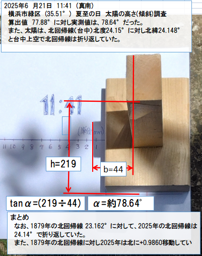 原田常治さんは、昭和57年5月発行された「気温の周期と人間の歴史」本の中で、夏至 太陽の北回帰線を調査されていた。1879年は、台湾の寿義付近の上空、1973年は、台湾、台中の上空と調査されていた。また、2025年は、台湾の新竹と台中の中間まで、北回帰線が上昇すると書いていた。本年は、2025年である。2025年の今年の北回帰線を調査した。但し、台湾でなく、日本の横浜市で実施した。