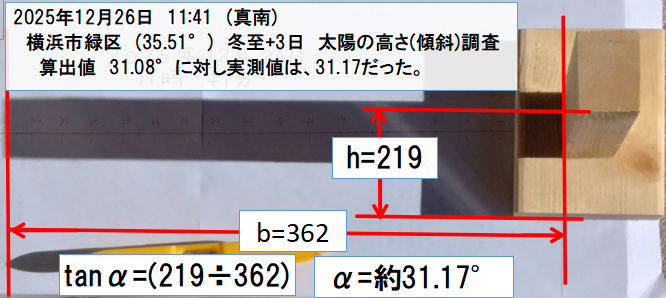 冬至・北緯35.5度の太陽高度 31.484977°、31°29分5秒 (東京 北緯35度 30°)